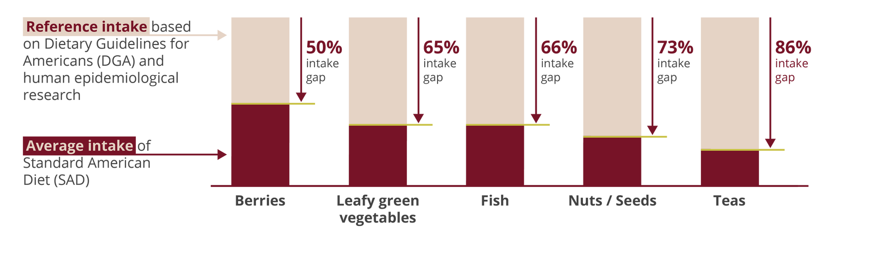There is a growing body of scientific research showing that nutrition plays an important role in the prevention, onset and severity of age-related brain decline, and can improve things like memory and brain fog. Proper nutrition also reduces risk of neurological diseases like Alzheimer’s, Parkinson’s and other dementias. We applied advanced data analytics to evaluate thousands of world-class dietary studies and determined that people who consume a Mediterranean-type diet enjoy a lifetime of the best brain health. We then identified critical nutrient gaps between these brain-healthy diets and the Standard American Diet.