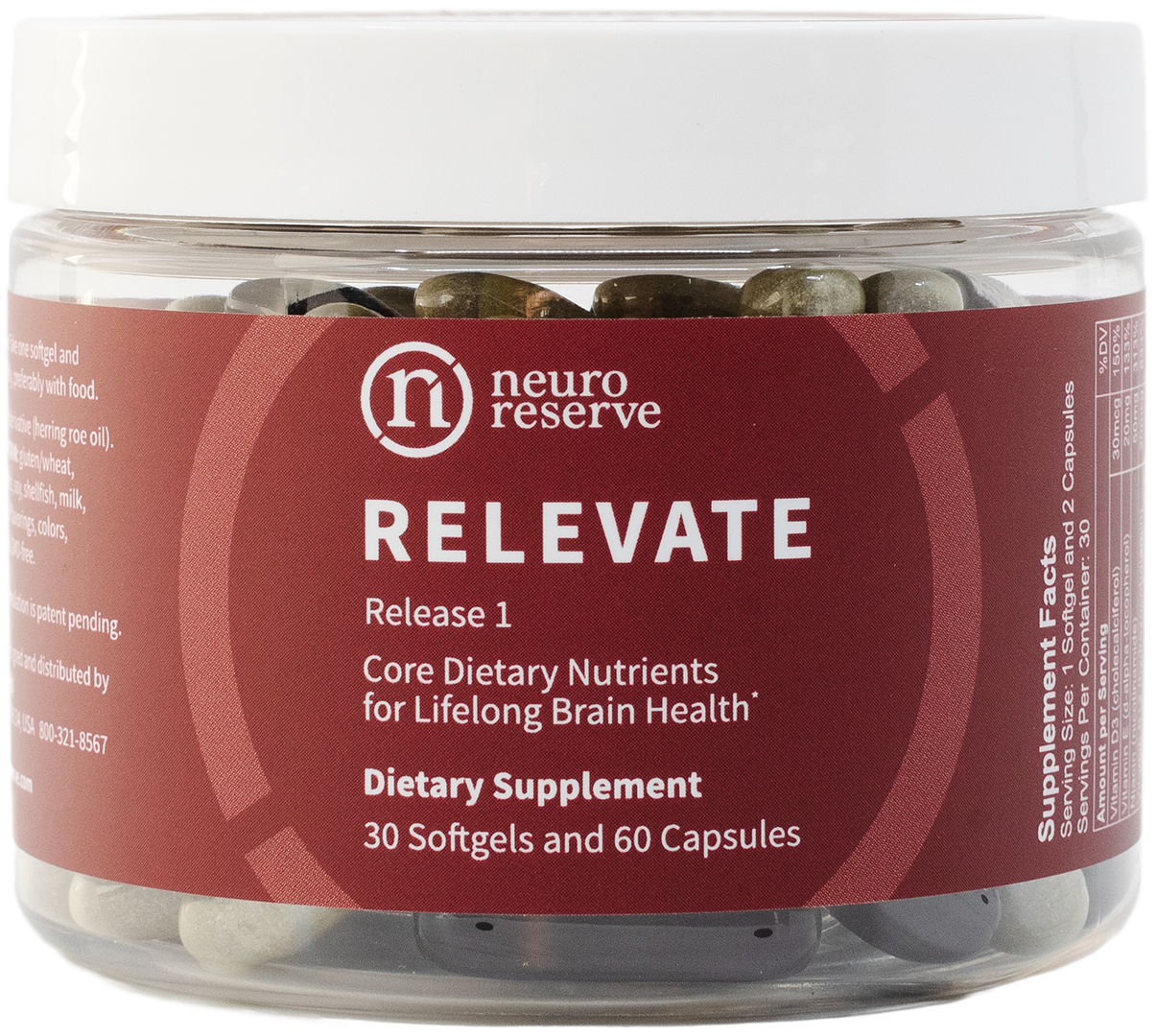 RELEVATE is the first and only nutritional supplement designed specifically upon brain protective dietary patterns, like the Mediterranean diet and MIND (Mediterranean-DASH Intervention for Neurodegenerative Delay) diet, developed by Rush University Medical Center. RELEVATE closes gaps in nutrients critical to maintaining lifelong brain health that most of us don’t get enough of in our everyday diets. RELEVATE is a regimen of 1 softgel and 2 capsules daily, containing 17 nutrients in specific ratios, doses, and high-quality forms to target the brain. RELEVATE is a new and powerful tool to help achieve comprehensive dietary health for our brains. It is designed, developed, and patent-pending by NeuroReserve.