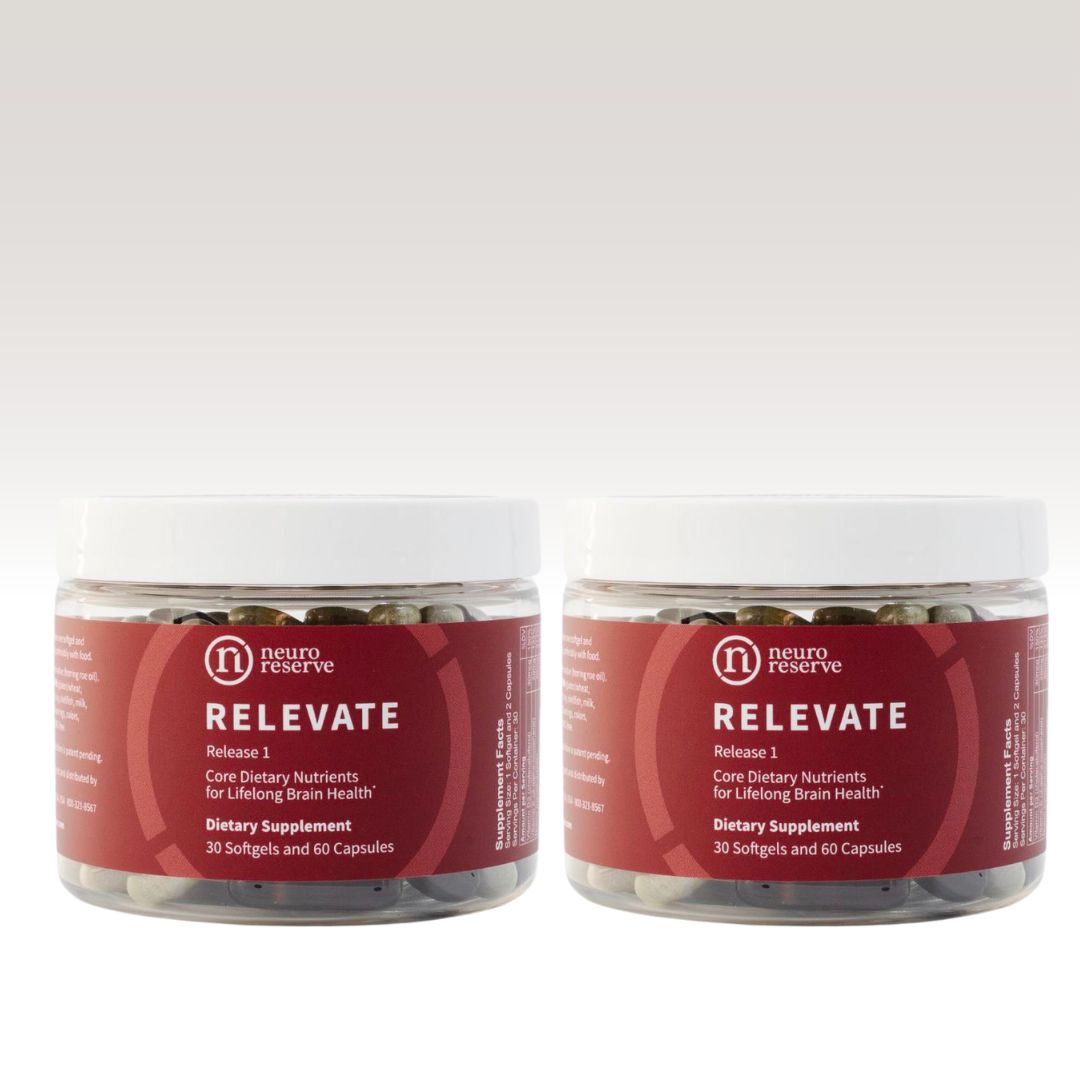 RELEVATE is the first and only nutritional supplement designed specifically upon brain protective dietary patterns, like the Mediterranean diet and MIND (Mediterranean-DASH Intervention for Neurodegenerative Delay) diet, developed by Rush University Medical Center. RELEVATE closes gaps in nutrients critical to maintaining lifelong brain health that most of us don’t get enough of in our everyday diets. RELEVATE is a regimen of 1 softgel and 2 capsules daily, containing 17 nutrients in specific ratios, doses, and high-quality forms to target the brain. RELEVATE is a new and powerful tool to help achieve comprehensive dietary health for our brains. It is designed, developed, and patent-pending by NeuroReserve.