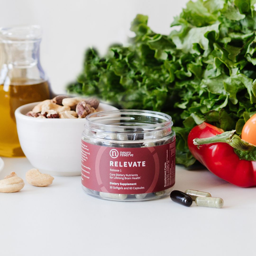 RELEVATE is the first and only nutritional supplement designed specifically upon brain protective dietary patterns, like the Mediterranean diet and MIND (Mediterranean-DASH Intervention for Neurodegenerative Delay) diet, developed by Rush University Medical Center. RELEVATE closes gaps in nutrients critical to maintaining lifelong brain health that most of us don’t get enough of in our everyday diets. RELEVATE is a regimen of 1 softgel and 2 capsules daily, containing 17 nutrients in specific ratios, doses, and high-quality forms to target the brain. RELEVATE is a new and powerful tool to help achieve comprehensive dietary health for our brains. It is designed, developed, and patent-pending by NeuroReserve.